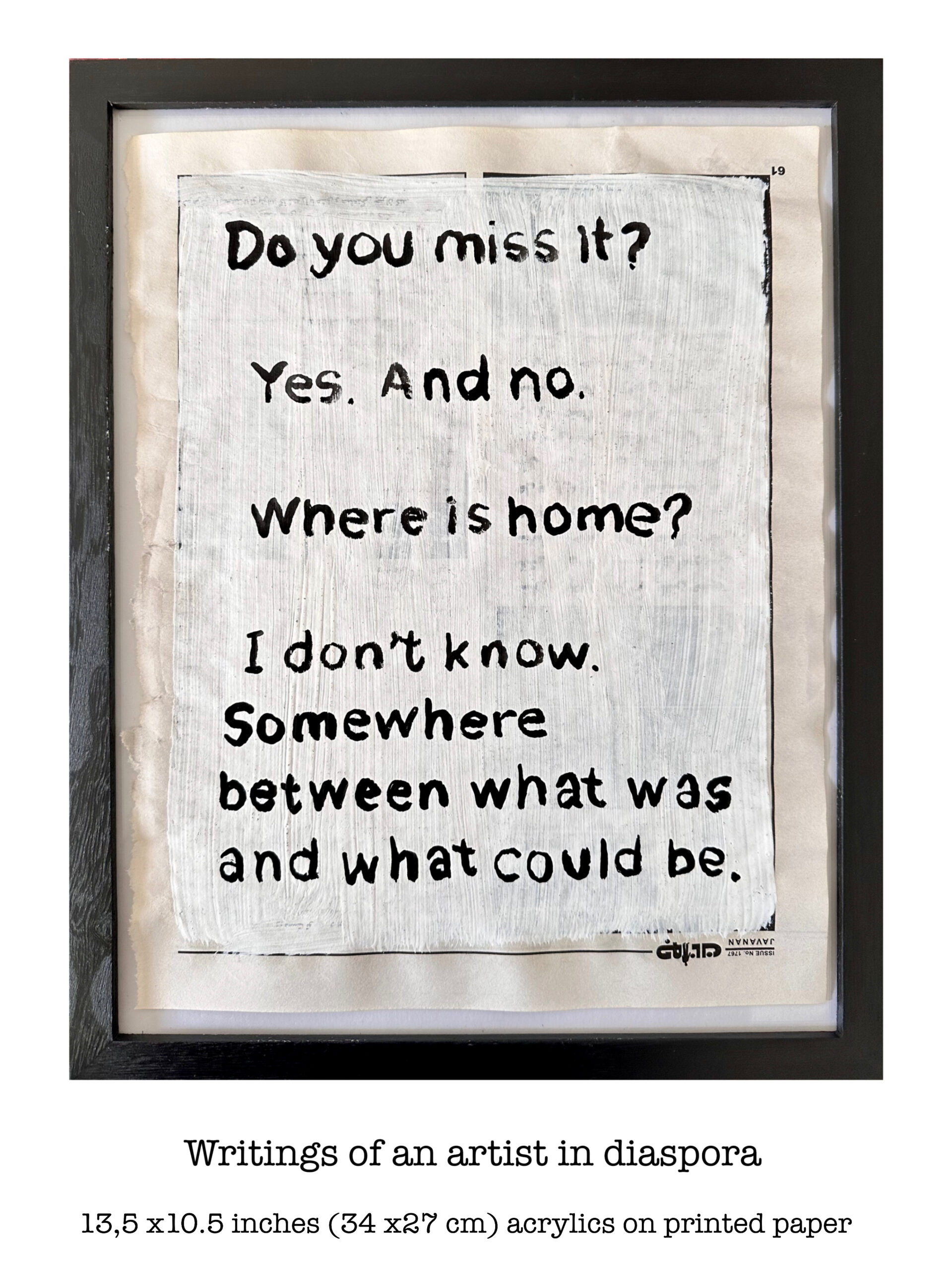 Words carry a heavy load, and by painting them, I am trying to convince myself that there is a home where I belong—wherever I might find it, wherever I might lose it.